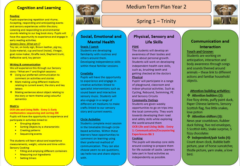 Students in Trinity Class follow the OCR Life and Living Skills Framework, working towards 2-3 different areas each term over three years to gain a qualification. We also conduct yearly assessments aligned with the Engagement Model so that we can meet students at their individual learning levels. We celebrate every achievement, big or small, through regular observations and reflections on Evidence for Learning, highlighting each pupil’s progress and success.