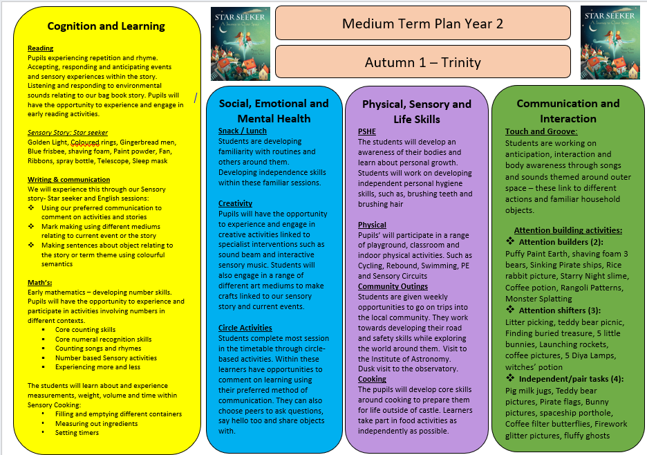 We tailor our activities around engagement, sensory exploration, life skills, and individual targets. Students participate in a variety of sessions including community trips, cooking, Attention Autism, PSHE, and themed maths and English work. Each term, we explore a new topic, breaking it down into weekly activities that promote curiosity, social interaction, and personal growth.