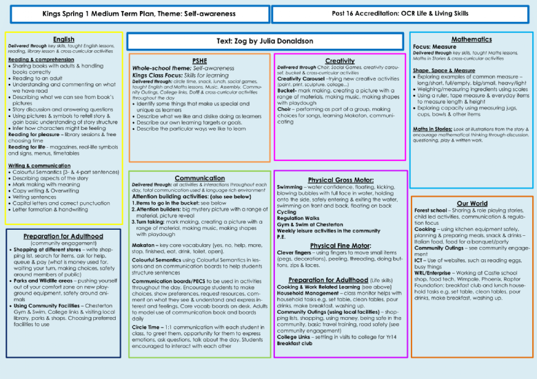 Welcome to Kings class. We are a 6th Form teaching group consisting of semiformal students working towards OCR Life and Living Skills Accreditation. We are a fun and exciting group of learners that enjoy engaging with our learning and developing our independent skills. We have a strong focus on preparation for adulthood and developing the skills necessary so we can succeed after school. We also focus on developing our communication skills throughout the day with an emphasis on being able to communicate our preferences and choices. We follow a curriculum that is based on a range of subject-based lessons, cross-curricular experiences, interventions, and targeted approaches. Our progress and achievement are tracked and celebrated via Evidence for Learning to use the Castle Assessment Framework (Rainbow and Gemstone).