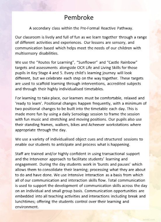 Welcome to Pembroke Class. We are a joyful, calm secondary class on the Pre‑Formal Reactive Pathway. We follow termly themes and associated sensory stories. These create rich, multi‑sensory learning opportunities through play, art, movement, and tactile exploration, supporting early communication, social engagement, and sensory development.