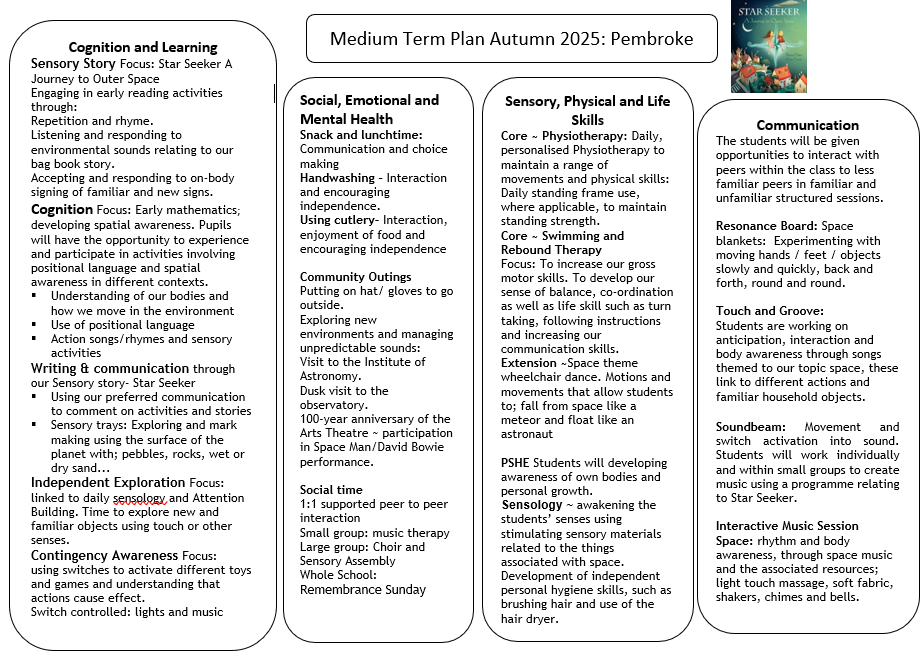 Curriculum: delivered through a blend of specialist interventions and engaging and motivating experiences, adapted and enriched using themes and texts.