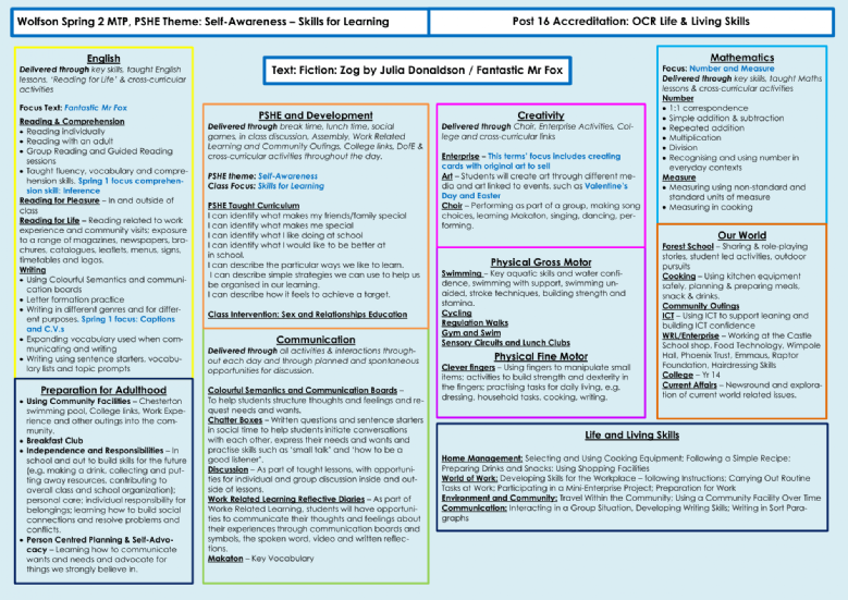Welcome to Wolfson class! We are a group of semi-formal KS5 students, studying for accreditation in Life and Living Skills. In Wolfson class, there is a focus on managing our well-being, preparation for adulthood and the development of our independence, so we have skills we can take with us into the wider world after we finish our Castle School journey.